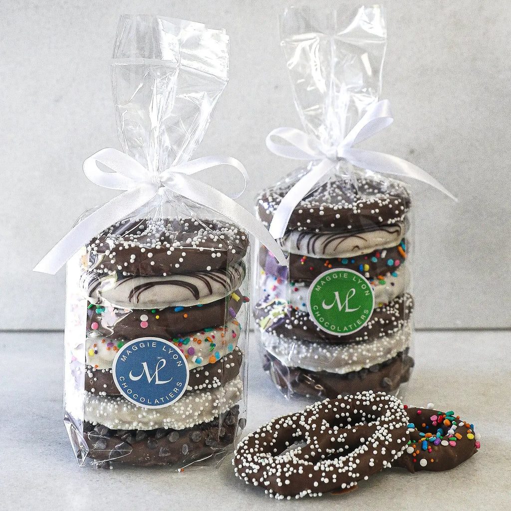 Milk and white chocolate enrobed 3-ring pretzels decorated with chocolate drizzle, nonpareils, jimmies, and colorful sprinkles.
