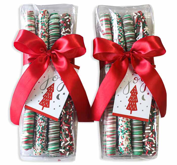 Want a festive sweet treat with a little extra crunch? These crispy pretzel rods, robed in milk and white chocolate, are decorated with sprinkles and a chocolate drizzle in delightful holiday colors. It's an unbeatable stocking stuffer for someone special!