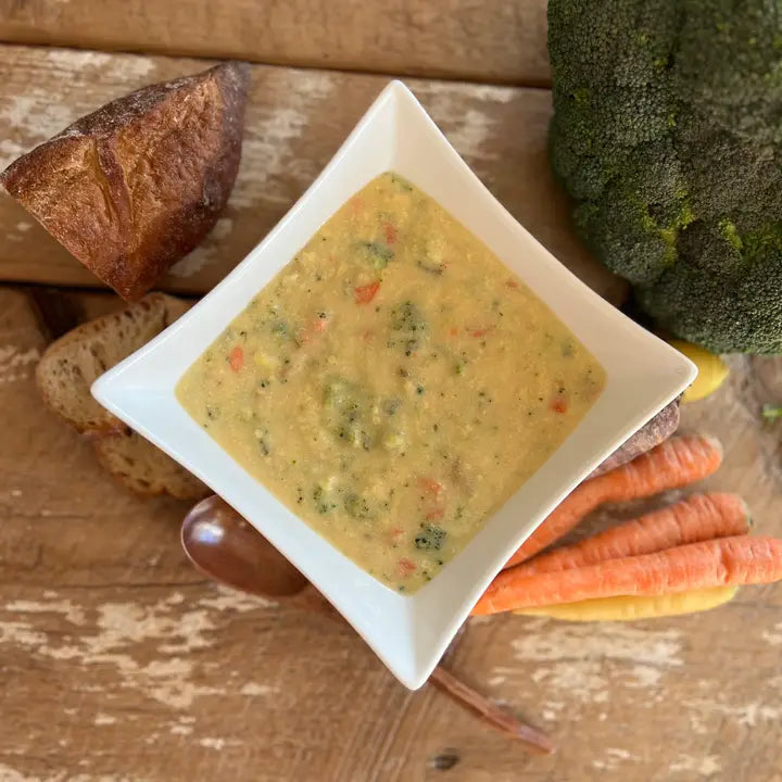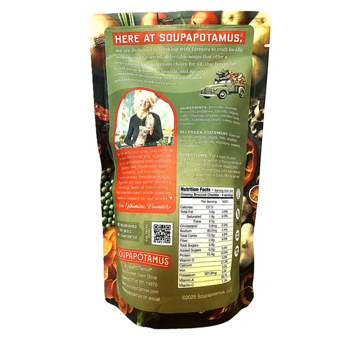 This creamy blend features organic potatoes, real cheddar cheese, and grass-fed dairy, combined with vibrant Upstate New York organic broccoli and carrots. Gluten-Free to suit some dietary preferences without compromising the great taste. Quick and Convenient: Dehydrated for easy preparation—just add water and savor. Flavorful and Unique: The creamy flavor and real broccoli sets this soup apart. No Artificial Ingredients: Clean, simple farm ingredients your customers can trust for a healthy body-and-soul meal. Ideal for home, work, or outdoor adventures like camping. It is a delicious, convenient meal wherever your customers choose to enjoy it! All they need is water and a heat source! They simply add all of the bag contents to 4 cups of cool water, heat to a low boil and simmer for about 15 minutes Each package makes 4 good-sized servings.