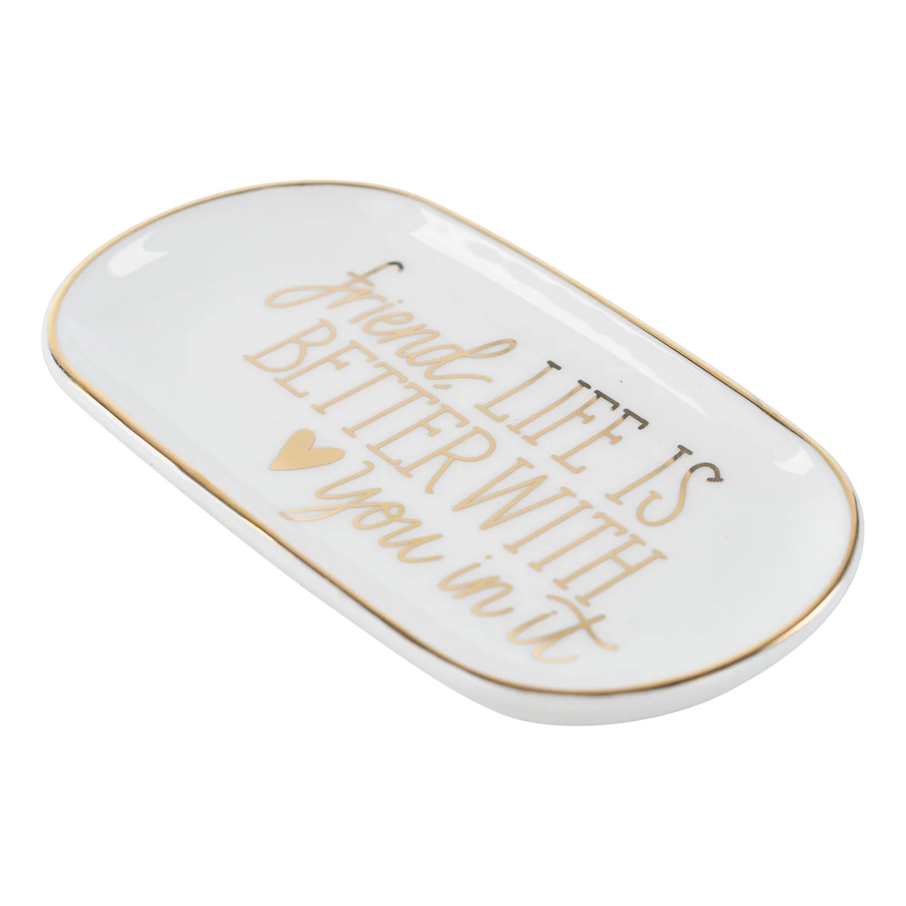 Show your appreciation with the Friend, Life is Better with You Trinket Tray, a thoughtful and meaningful gift for a cherished friend. Featuring a heartwarming message, this ceramic tray is perfect for holding jewelry, keys, or small keepsakes while reminding your friend of how much they mean to you. Its elegant design adds a touch of charm to any space, whether on a vanity, nightstand, or entryway. A perfect way to celebrate friendship and brighten their day, this trinket tray is both functional and full of love.