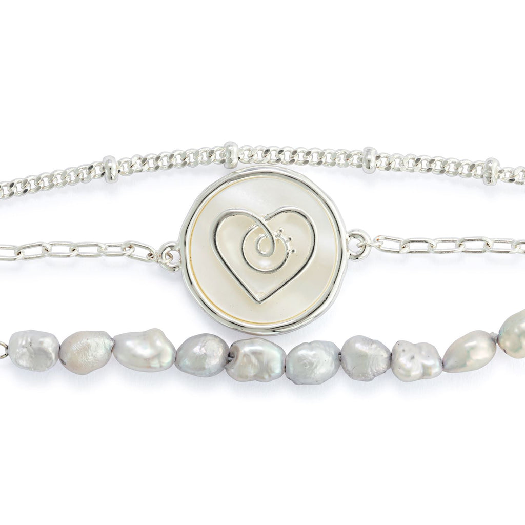 While living each day with a heart full of gratitude is something we all strive to do, sometimes we need a little reminder of the people, places and experiences we are lucky to have. Designed to offer meaningful gifts for family, friends or oneself, the Grateful Heart Mother of Pearl Bracelet - Silver features a trend-right, layered look with real Mother of Pearl inlay and heart accents.