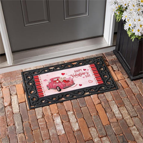 Sweep guests off their feet with our beautifully made Sassafras mats! Made with bright pops of color that are perfect for the season, this mat will put pep in anyone's step. Crafted from heat-sublimated polyester with a rubber backing, this versatile mat is designed to fit perfectly within Evergreen's switch doormat bases. The mildew resistant mat is ideal for indoor or outdoor use and features a skid-resistant backing to help keep it in place. This welcoming mat will freshen up your stoop season after season while ensuring your home stays debris-free. For stains, simply spot clean with soap and warm water.