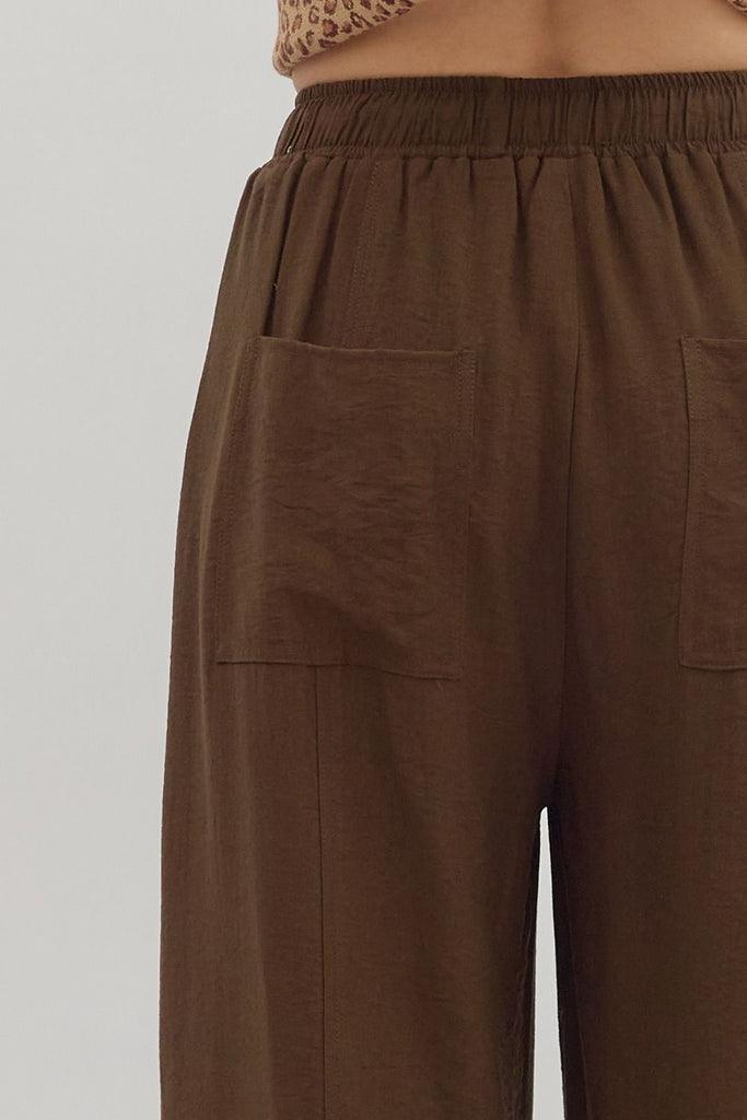 Solid high-waist pull-on wide-leg pants featuring asymmetrical pocket detailing at front and patch pockets at back. Drawstring adjustable elasticated waistband. Lined. Woven. Non-sheer. Lightweight.