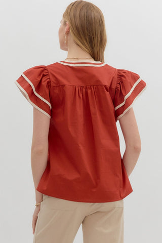 Solid flutter sleeve mutlicolor accent V-neck top featuring embroidered applique at front. Unlined. Woven. Non-sheer. Lightweight.