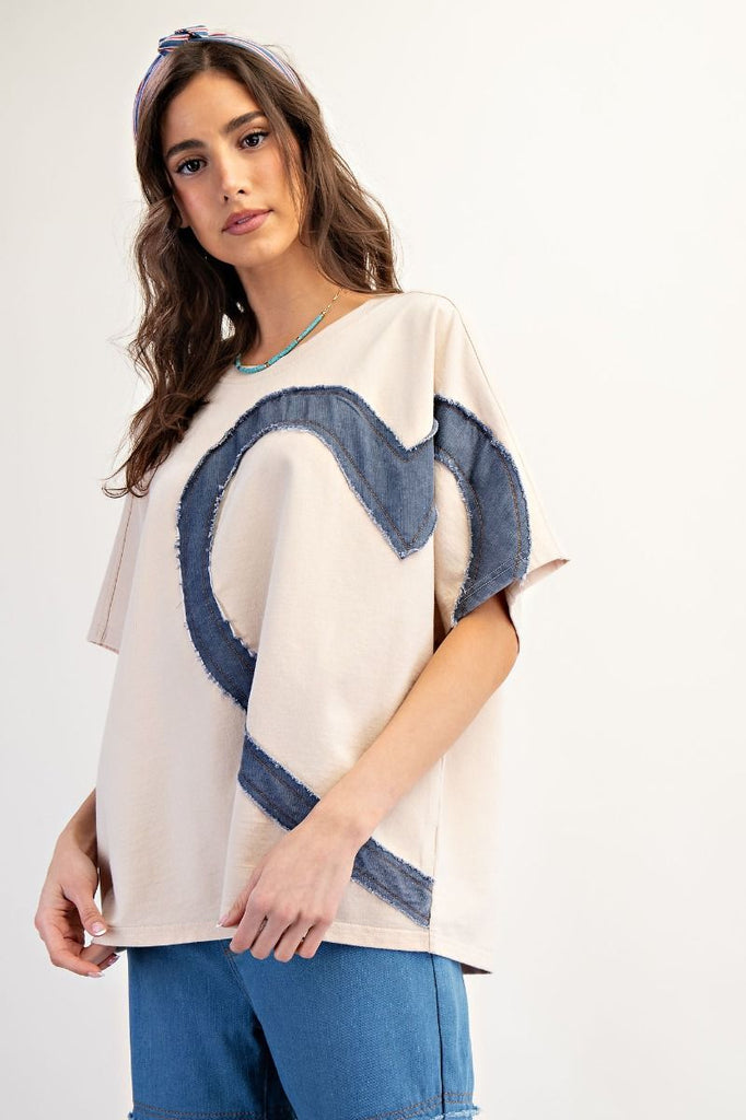 Description: HEART PATCH MINERAL WASHED KNIT TOP-WIDE SHORT SLVS-RAW CUT AND FRAYED HEART PATCHWORK-BOXY SILHOUETTE-LIGHTWEIGHT FABRICATION-RELAXED AND LOOSE FIT-SMALL MEASUREMENTS : LENGTH - 26 3/8" & BUST - 28.75"
