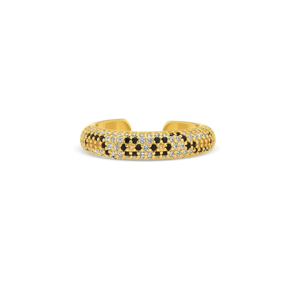 Crafted with a brass base, this ring is then plated with 18k Gold offering the rich, warm luster of solid gold. What truly makes this ring stand out is its eye-catching animal print detail, intricately formed with shimmering cubic zirconia (CZ) stones. These sparkling CZ accents mimic the brilliance of genuine diamonds, ensuring you make a dazzling impression.
