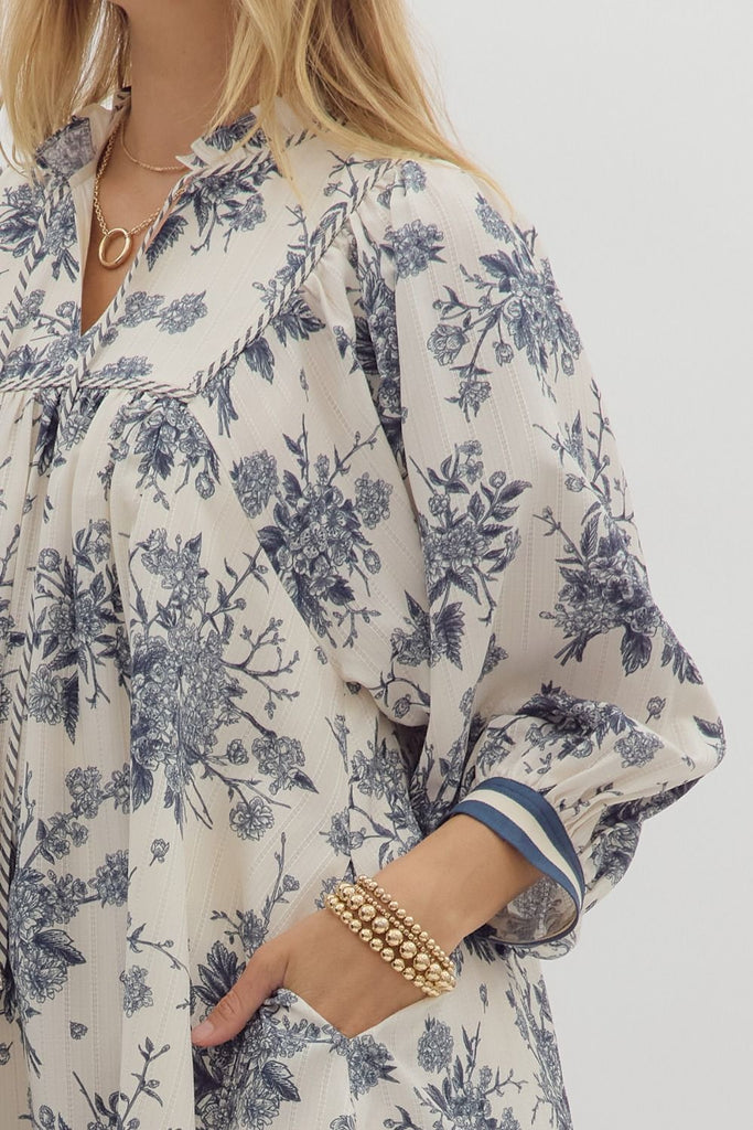 Textured floral print ¾ sleeve pullover mini dress featuring stripe contrast striped binding detailing. Side Pockets. Lined. Woven. Non-sheer. Lightweight