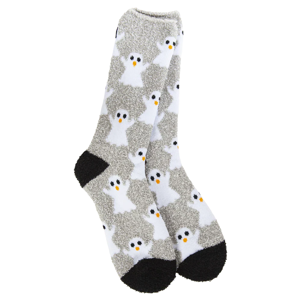 Boo-tifully cozy and frightfully fun—The World's Softest Socks Fall Cozy Crew in Ghostly Grey are the perfect Halloween treat for your feet! These ultra-soft socks feature an all-over print of adorable white ghosts on a heathered grey background, complete with contrasting black toes for a playful seasonal touch.