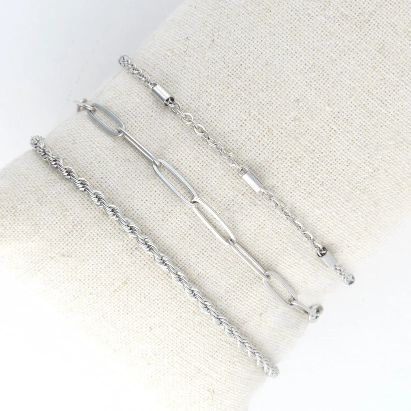 A modern take on classic designs! The Narelle Waterproof Twisted Chain Bracelet Set offers three golden bracelets in trendy Paper Clip, Twist, and Dainty Chain designs. Wear them together as part of a stack, or on their own for a delicate, minimalist look. They styling options are endless! Waterproof , 18K gold plated and made with a specialized PVD technique to withstand the rigors of life, from swimming and showering to sweating through your most intense workouts, all without ever losing its shine.