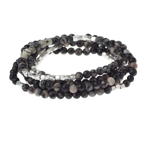 Tap into the energies of the earth. Semi precious gemstones adorn wrist & neckline. Effortlessly converts from bracelet to necklace. Can be wrapped 4-5 times as a bracelet and 1-2 times as a necklace.